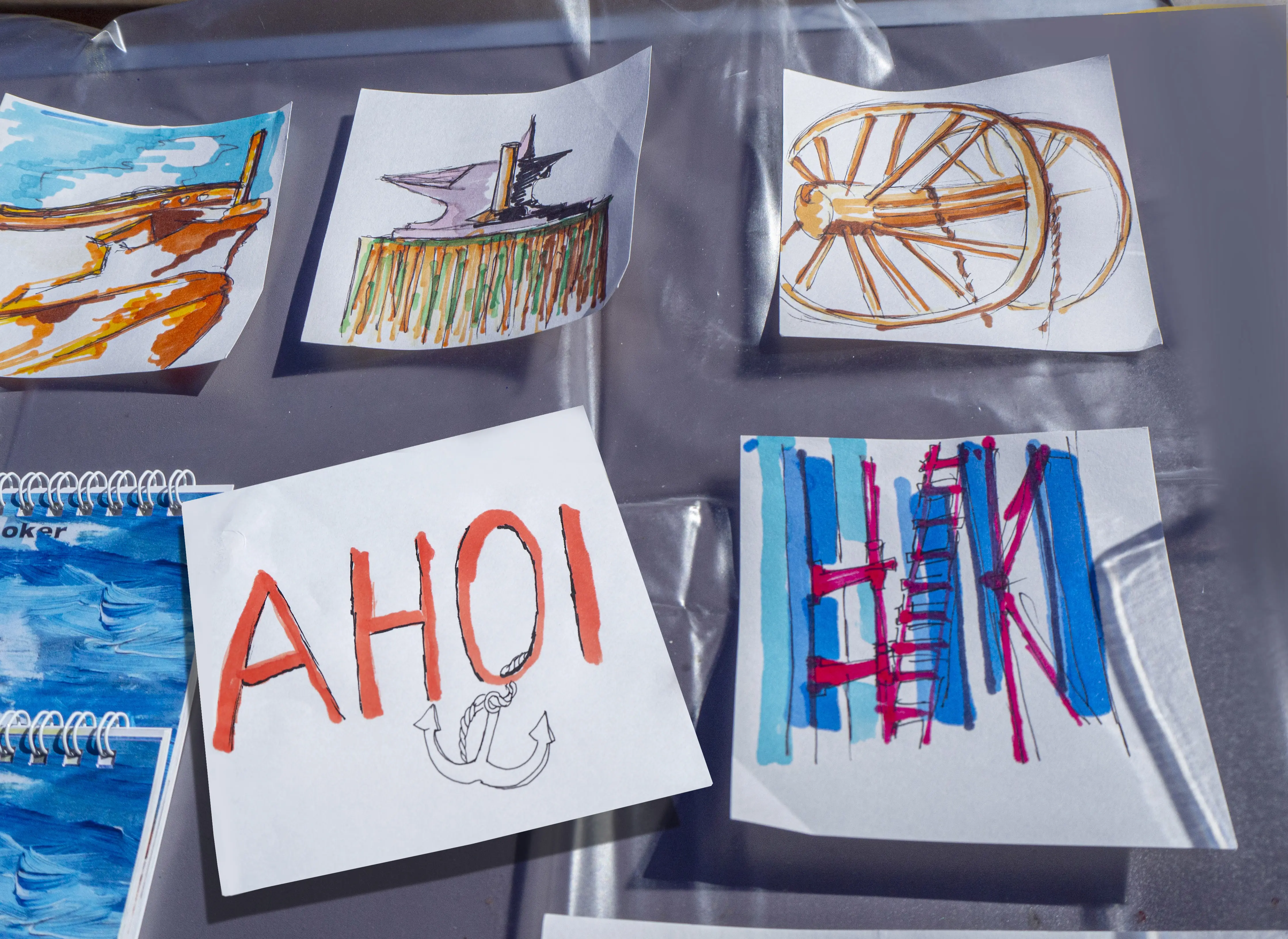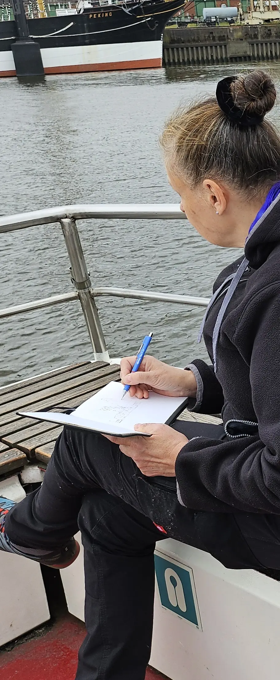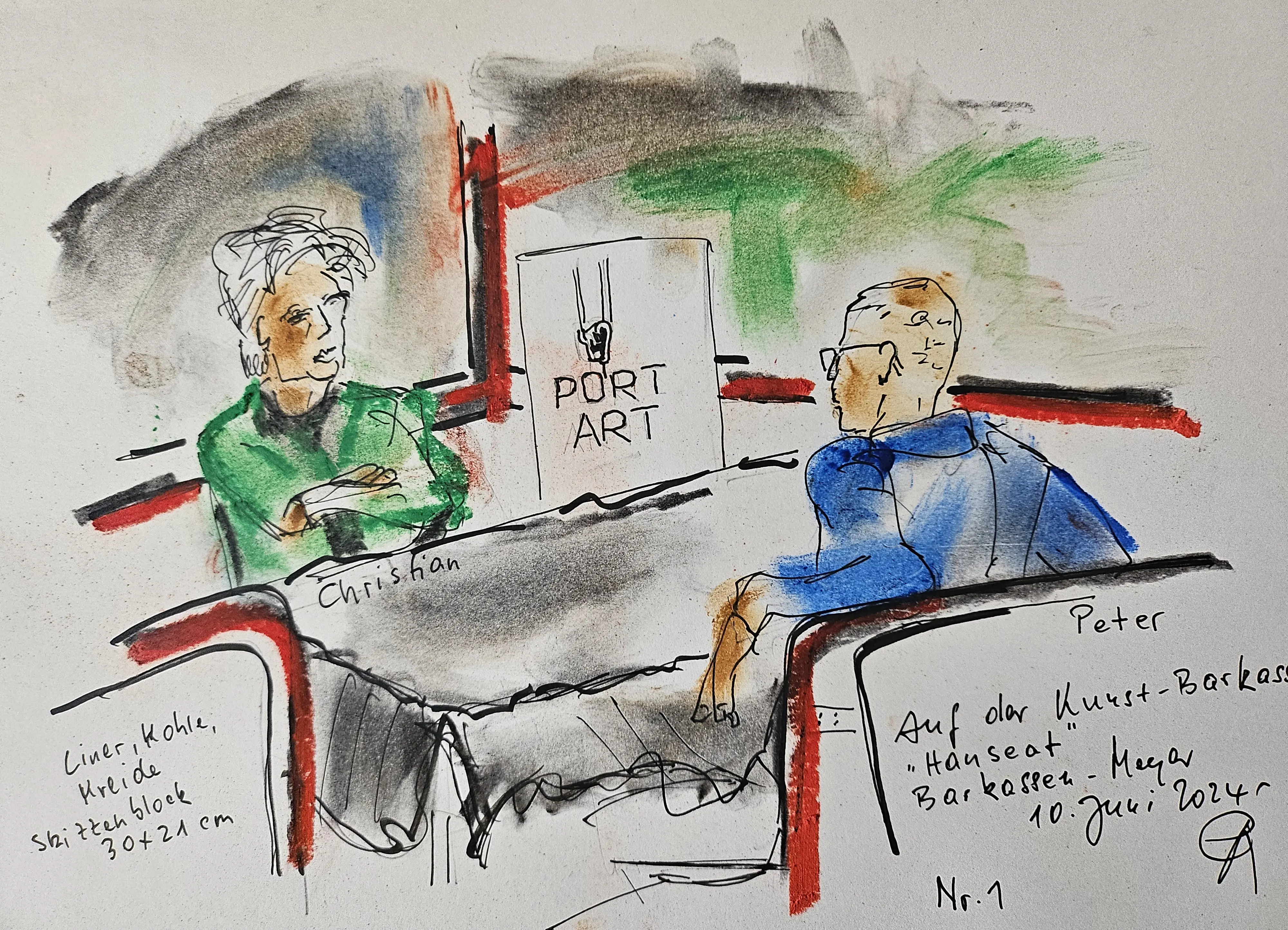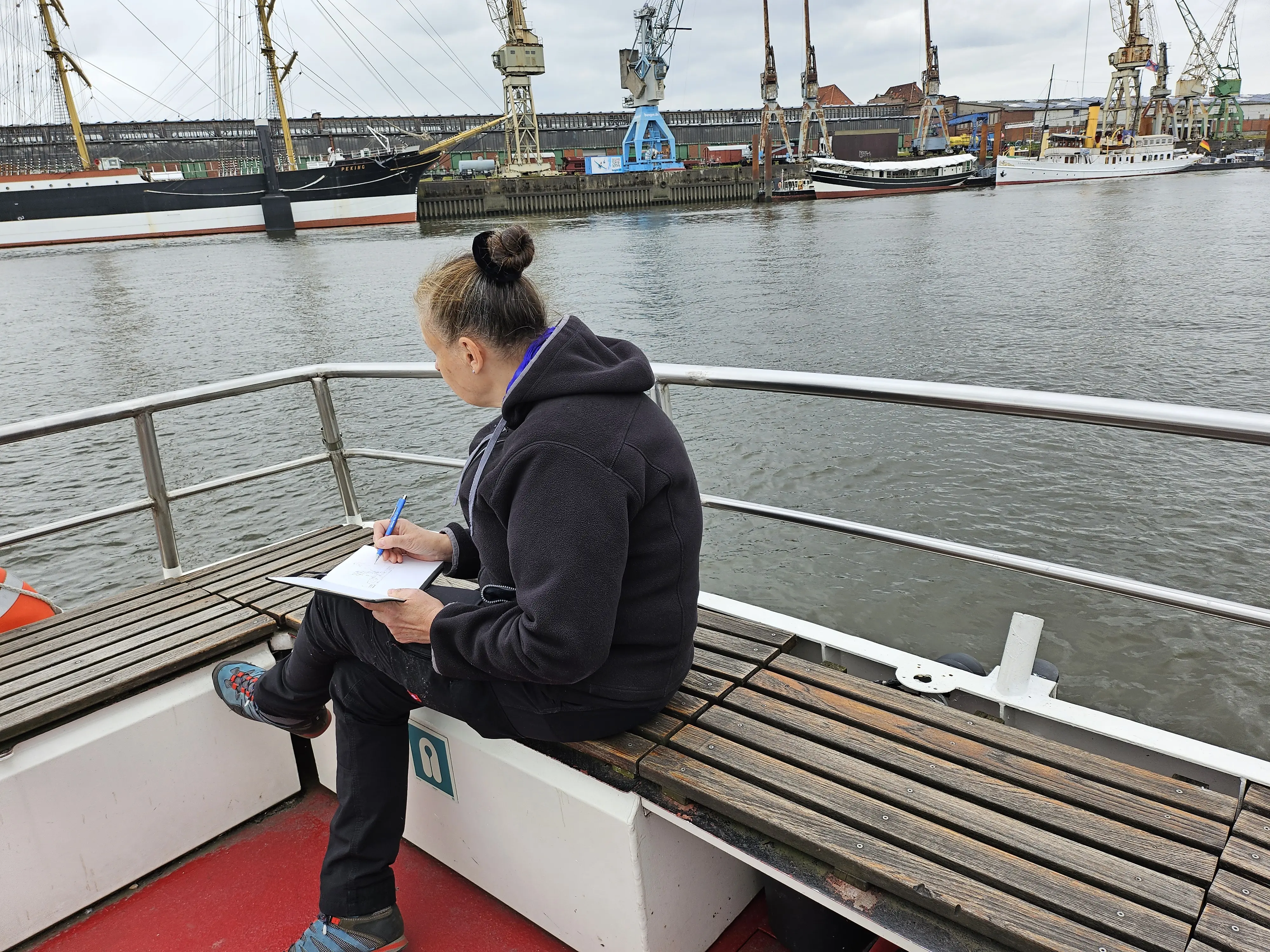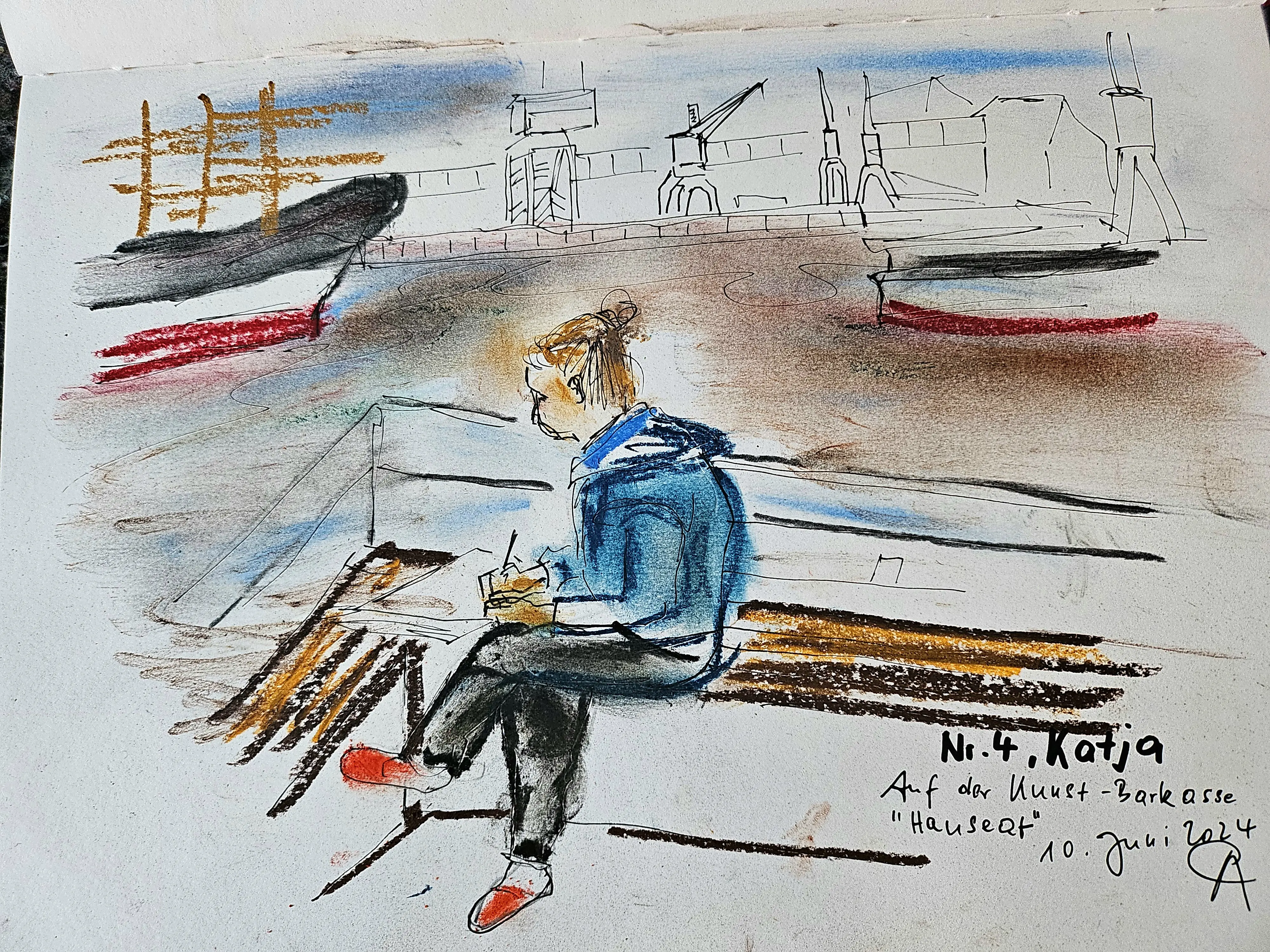 Seit ich laufen kann bin ich mit Stift und Pinsel unterwegs, um die Themen, die mich faszinieren, festzuhalten. Die Liebe zum Meer und zu Schiffen trieb mich vom Rheinland an die Küste und an Bord der Bark „Alexander von Humboldt“. Über die Zeit an Bord bin ich auch beruflich im Schiffbau angekommen, habe Bootsbauerin gelernt und auf verschiedenen Werften gearbeitet. Heute bin ich im Deutschen Hafenmuseum tätig und habe viel Freude an der Verbindung von Hafen und Kultur. Durch die Mitarbeit bei PortArt in meiner Freizeit kann ich der Kunst wieder mehr Raum in meinem Leben geben und mich im Team künstlerisch weiterentwickeln.