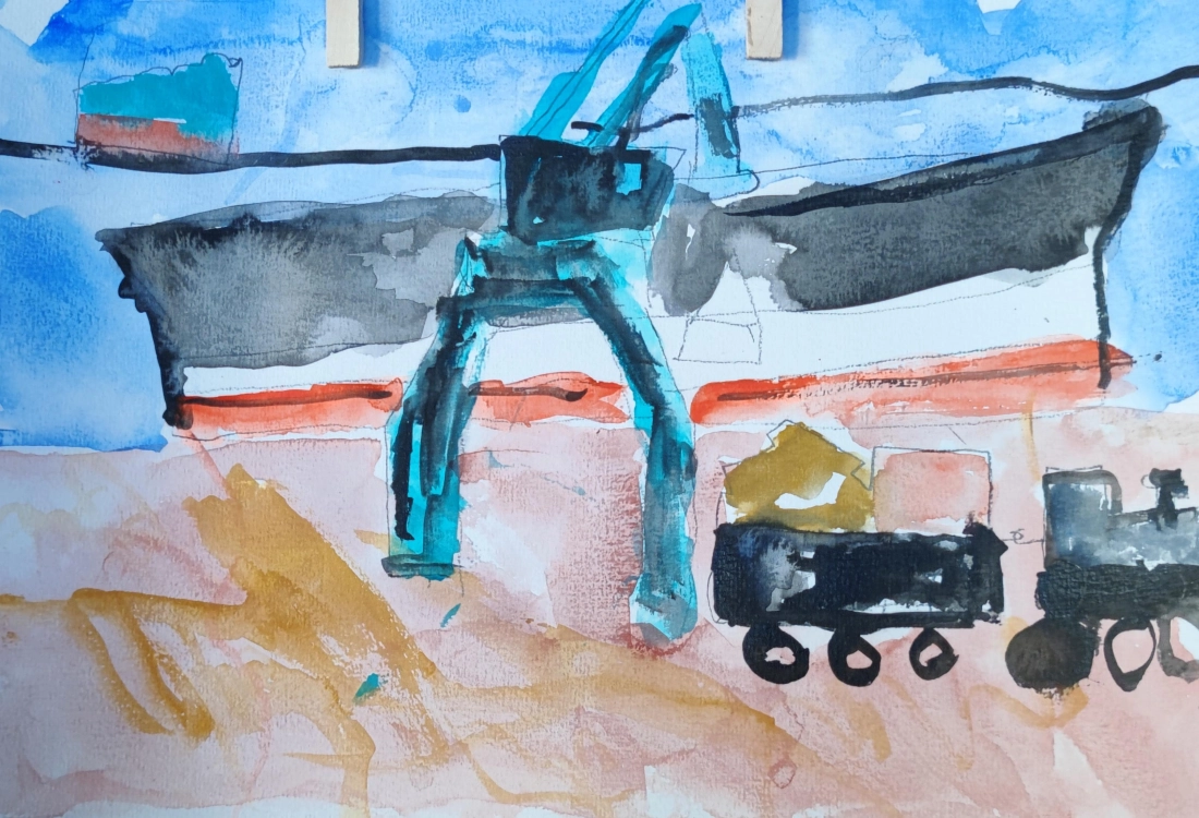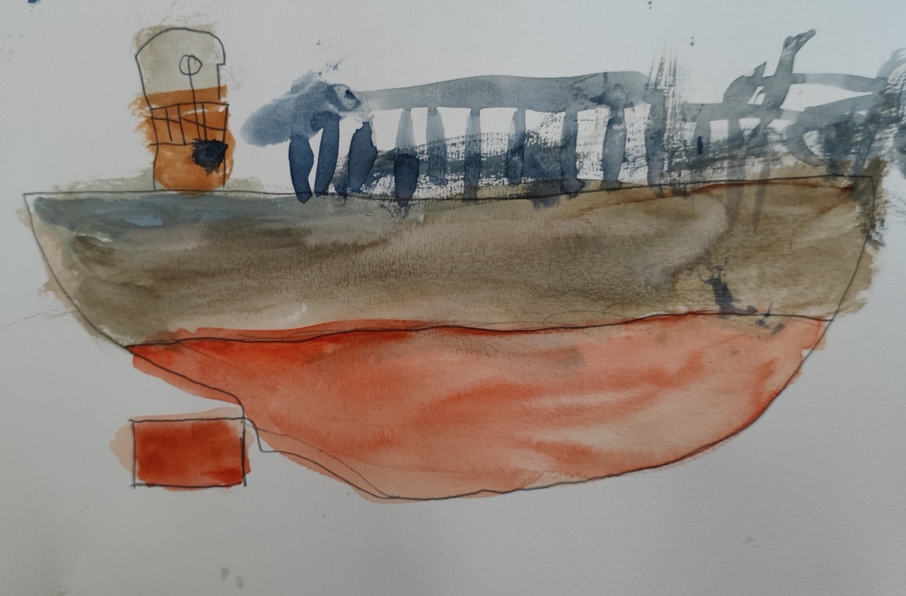 Ich beschäftige mich in meinen Bildern zum einen mit Spurensuche und Fundstücken wie Reste und Wrackteile von Schiffen und Booten. Diese finde und fotografiere ich in Häfen, am Meer, an Flüssen und Seen. In Collage, Zeichnung und Malerei entwickelt sich dann das Bild, das Details und Elemente der Fundorte visualisiert. Daneben betrachte ich Strukturen in Natur und konstruierter Umgebung, die ich zum Beispiel an Küsten und Felsformationen finde.